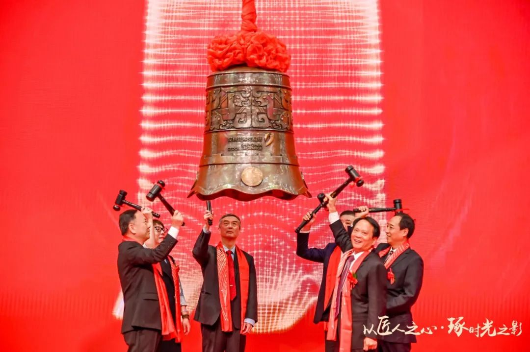 緊接著,由東鵬控股董事長何新明、清遠市委常委、常務(wù)副市長呂成蹊、佛山市副市長趙海、中國建筑衛(wèi)生陶瓷協(xié)會會長繆斌、東鵬優(yōu)秀經(jīng)銷商代表伍鴻達、東鵬核心技術(shù)骨干代表姜安寧共同敲響開市寶鐘。